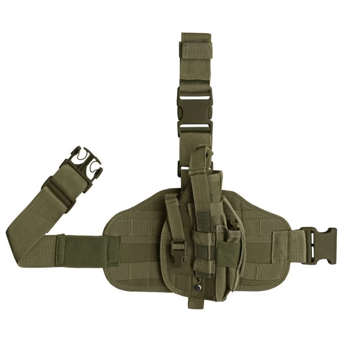 Das taktische Oberschenkelholster von MFH überzeugt vor allem durch die Molle-Aufnahmepunkte, die es ermöglichen weitere Ausrüstung oder Tarnmaterial an das Holster anzubringen.
