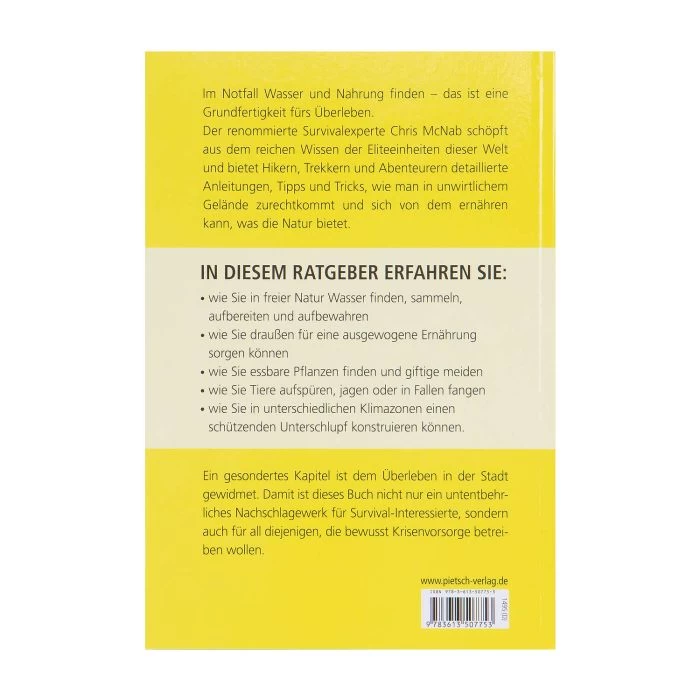 Im Notfall Nahrung und Wasser zu finden ist überlebenswichtig und hat oberste Priorität. Survivalexperte Chris McNab gibt detaillierte Anleitungen und verrät seine Tipps und Tricks, um sich in unwirtlichem Gelände von dem ernähren zu können, was die Natur bietet. Er erklärt, wie man in freier Natur Wasser sammelt, aufbereitet und aufbewahrt, und wie eine ausgewogene pflanzliche und tierische Ernährung gewährleistet werden kann, um möglichen Mangelerscheinungen vorzubeugen. Auch die Konstruktion eines geeigneten Unterschlupfs für unterschiedliche klimatische Bedingungen ist Teil des Buches. Ein gesondertes Kapitel ist dem Überleben in der Stadt gewidmet. Damit ist dieses Buch nicht nur ein unentbehrliches Nachschlagewerk für Survival-Interessierte, sondern auch für all diejenigen, die bewusst Krisenvorsorge betreiben wollen.