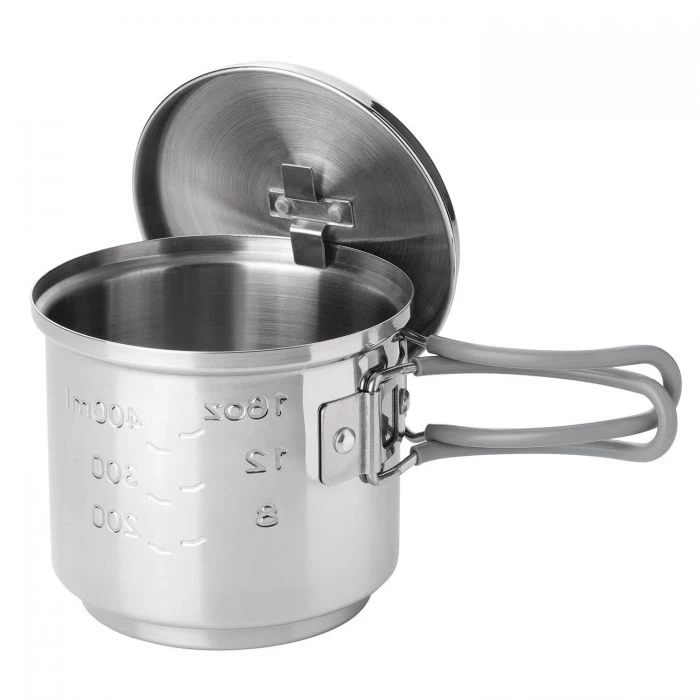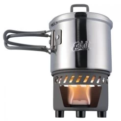 Bei einer Trekkingtour spielt meist jedes zusätzliche Gramm eine Rolle. Umso besser, dass es das Trockenbrennstoff-Kochset CS585ST von Esbit gibt. Bestehend aus einem Gestell für den Brennstoff und einem Topf mit 585 ml Fassungsvermögen, ist das kleine Set kompakt, stapelbar und macht das Kochen im Freien super einfach. Besonders praktisch ist, dass der Stand ganz einfach im Topf verstaut und die Topfgriffe eingeklappt werden können. Eine Aufhängung am Deckel, sowie eine Skala im inneren des Topfes sind ebenfalls vorhanden.