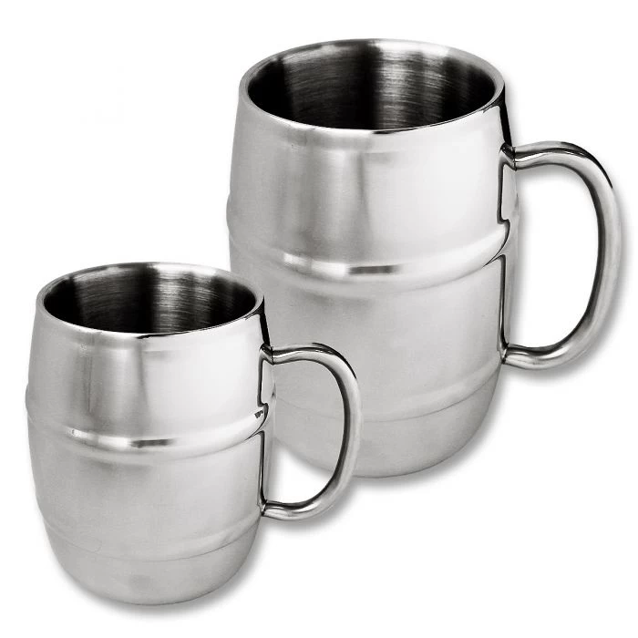 Origineller Becher aus Edelstahl, in Form eines klassischen Bierkrugs. Somit kann auch der beliebte Gerstensaft auf Campingtouren standesgemäß getrunken werden. Die doppelwandige Thermokonstruktion hält das Bier im Krug entweder schön kalt oder den Kaffee am Morgen danach, hervorragend warm. Mit stabilem Edelstahlgriff. Die Tasse ist in zwei Größen erhältlich: 450 ml oder 1000 ml. Material: Edelstahl poliert.