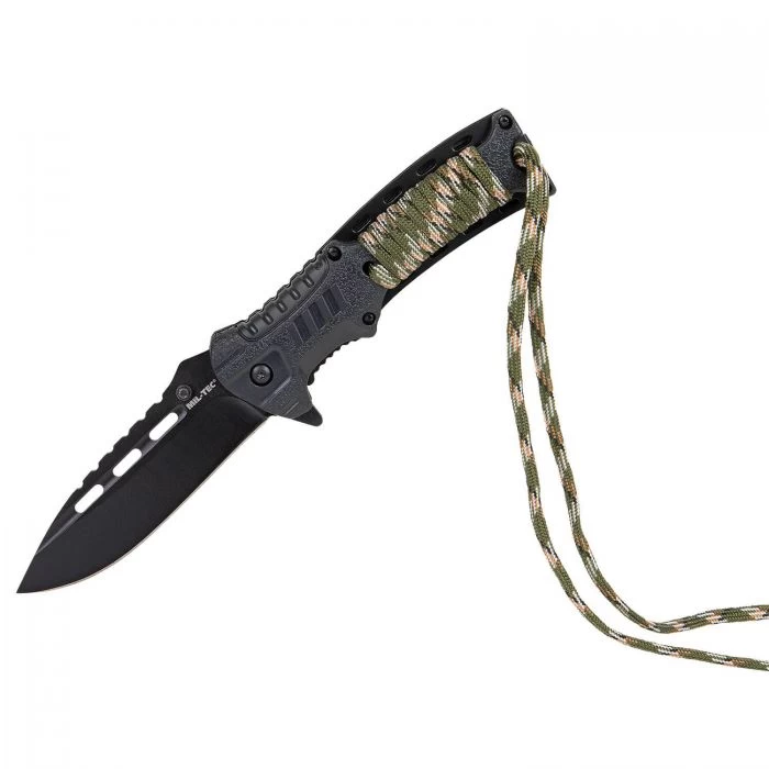 Das Einhandmesser Paracord mit Fire Starter von Mil-tec überzeugt nicht nur durch sein handliches Design sondern auch praktische Details wie die integrierte Paracordsleine im Griff, Daumenpins sowie den im Griff eingelassenen Fire Starter mit integrierter kleiner Pfeife.