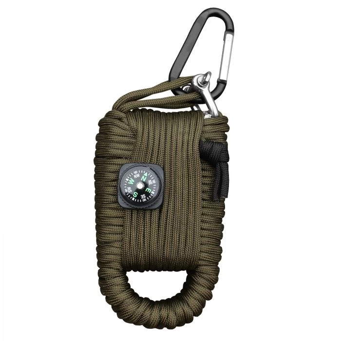 - besteht aus: – Paracord Seil (100% Polyester) – Karabiner (6 cm) – 2 Anzünder – Feuerstein – Drahtsäge – 2 Pflaster – kleiner D-Bügel – Paracord-Armband – Kompass – Pfeife – Angel-Set (4 Haken, 2 Angelschnüre, 2 Gewichte) – 2 Sicherheitsnadeln – kleine Messersäge – wasserdichte Metallkapsel