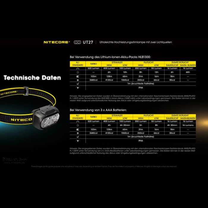 Die Stirnlampe UT27 von Nitecore ist leicht und leistungsstark. Die Lampe wird mit einem Li-Ion Akku (mit USB-C-Ladeanschluss, im Lieferumfang enthalten) betrieben, kann aber genauso gut mit 3 x AAA Micro-Batterien betrieben werden. Die Nitecore UT27 verfügt über folgende Lichtquellen: