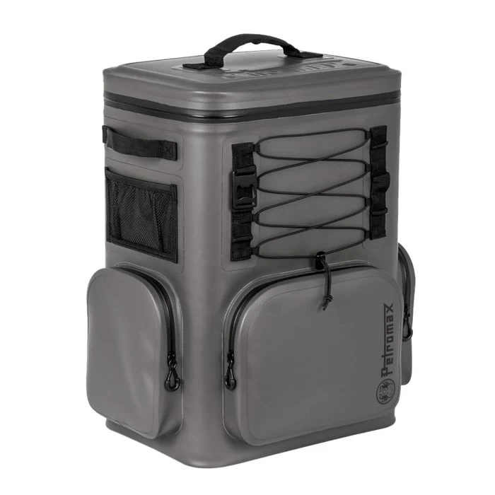 Mit dem Kühlrucksack von Petromax werden deine Speisen und Getränke bis zu 6 Tage gekühlt, und das ganz ohne auf Strom angewiesen zu sein. Nach 6 Tagen unterwegs wird immer noch eine Temperatur von 8°C gemessen. Die Kühlung erfolgt mit Eiswürfeln. Der Rucksack verfügt über einen Brustgurt, Rückenpolsterung und verstellbare Schultergurte für einen optimalen Tragekomfort. Der wasserdichte Reißverschluss sowie das wasserabweisende Nylongewebe schützen vor dem Auslaufen des Schmelzwassers. An den Laschen kann beliebiges Zubehör und Ausrüstung mit Karabinern befestigt werden, weitere Gegenstände befestigst du mit Hilfe der Spanngummis. In der großen Fronttasche, den beiden Seitentaschen und den Netztaschen findest du Zubehör zum Feuer machen. Auch Geschirr und Besteck kannst Du im Kühlrucksack transportieren. Alles in allem ist der Kühlrucksack von Petromax der ideale Begleiter für mehr als 6 Tage lang unabhängige Kühlung bei Deinem nächsten Outdoor-Abenteuer.